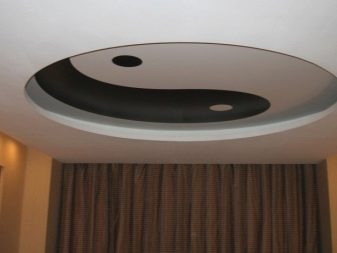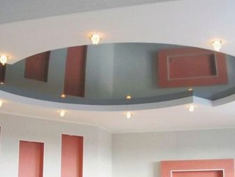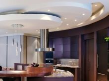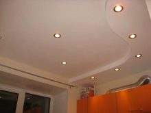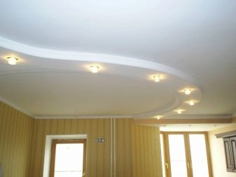 Окачен таван на две нива може да има по-ниско ниво с различни геометрични форми. Тъй като вътрешният слой е по -малко вентилиран, ще трябва да използвате материал, устойчив на влага. Над измазаната повърхност трябва да се постави бордюр по периметъра на стените. Разликата между етажните нива може да се изрази в подреждането на острови от гипсокартон, които улесняват горното разпределение на зоните в пространството. В такава схема второто ниво е заето от вградени лампи или светлинни ленти..