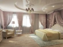 За спални се препоръчва използването на структури с гладка геометрия, боядисани в пастелни цветове. Сиянието трябва да е меко и да не е прекалено енергично. Снимки на звездното небе, извисяващи се облаци и други успокояващи теми са подходящи за помещения, където трябва да се отпуснете и да се отпуснете. Слабите светлини с трептящ ефект или модел, даден от флуоресцентни източници на светлина, помагат да се увеличи романтиката на атмосферата. По -добре е да откажете регистрация с помощта на неонови ленти, такова решение е по -подходящо за коридора и коридора.