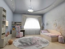 Таванът в детската стая има свои собствени характеристики. Там е невъзможно визуално да се претоварва стаята – колкото по -малка и по -ниска е тя, толкова по -спокоен трябва да бъде дизайнът. Възрастните могат лесно да понасят гледката на масивни фигури, боядисани в различни цветове, но децата често възприемат такива неща като вид заплаха. Единственото оправдано използване на големи детайли е разпределението и подчертаването на зоните. Меките пролетни нюанси са идеални, светлината трябва да е млечна или леко жълта.