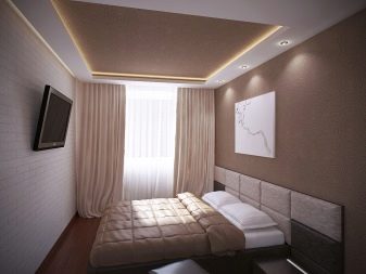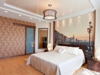 - V спалня трябва да се избягват контрастни комбинации, остри ъгли и ярка подсветка. Пастелно бежово, кафе и сиви нюанси изглеждат добре. Наситено синьото има успокояващ ефект, така че ако ви харесва този цвят, можете да изберете тези монохромни тавани. За спалнята можете да разгледате опцията „нощно небе“, космически ефекти, ненатрапчиви флорални и геометрични щампи.