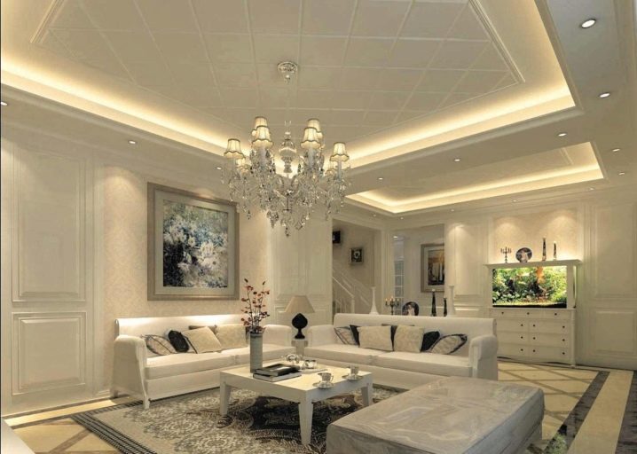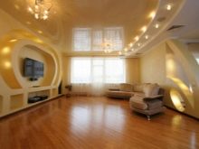 - Подиум за полилей. Размерите и формата зависят от дизайна на осветителното тяло. Като правило той се издига по-високо и това е един от най-практичните и икономични начини за организиране на таван на две нива..