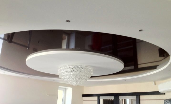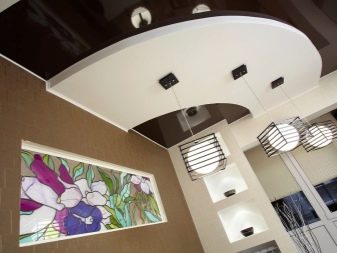 Доста често за организиране на тавана се използват 2 или повече материала. Например по периметъра на тавана можете да сглобите конструкция от гипсокартон, в която да оборудвате ниша за осветителни тела и да използвате опция за опън за второто ниво.