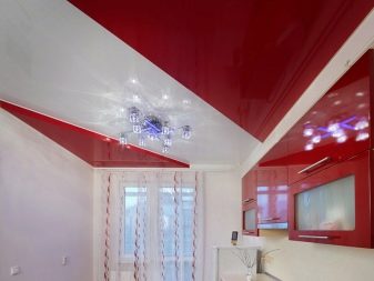 - На кухня ярки и контрастни комбинации изглеждат добре. Препоръчва се обаче да се използват не повече от 3 нюанса едновременно. Повечето осветителни тела трябва да бъдат разположени над работните и трапезариите. С помощта на различни цветове на тавана можете да зонирате и кухненската стая, докато тоновете на таванната конструкция трябва да се припокриват със сянката на фасадата на кухненския комплект. В малка кухня класическите дизайни с тясна рамка по периметъра и лъскаво второ ниво изглеждат добре.