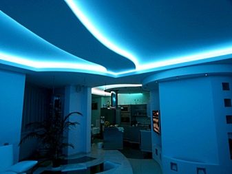 - LED ленти. Подходящи са за монтаж на тавани със сложни геометрични форми поради гъвкавостта на лентата. Те подчертават нивото отвътре по периметъра. Използва се заедно с контролера на LED лентата, който ви позволява да го включвате и изключвате, да променяте степента и сянката на осветлението, да изберете подходящия режим.