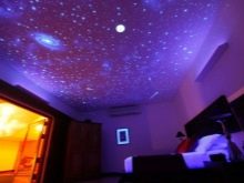 В спалнята таваните с имитация на звездното небе и космическата сфера изглеждат органично. Правилният дизайн и осветлението създават ефект на присъствие. Между другото, тази опция е доста подходяща в стаята на тийнейджър..