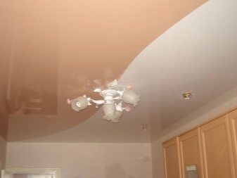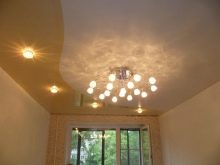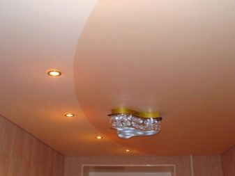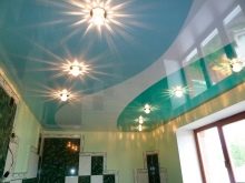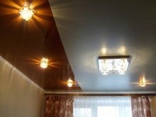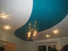 - Възможност за инсталиране на различни осветителни устройства. И полилеите, и прожекторите могат да се комбинират с PVC платна. Ограничението се отнася само за мощност, тъй като например лампите с нажежаема жичка могат да повредят филма при нагряване, така че те не могат да се използват като допълнителен източник на светлина. Премахването на изгорял дефект ще бъде много проблематично.