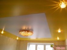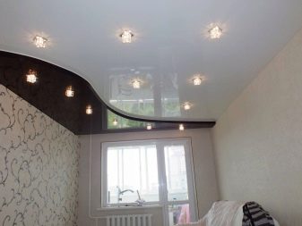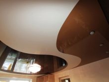 - Възможността за създаване на разнообразни декорни ансамбли. Можете да свържете 2 цвята към таван на едно ниво по много начини..