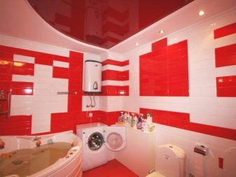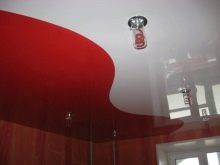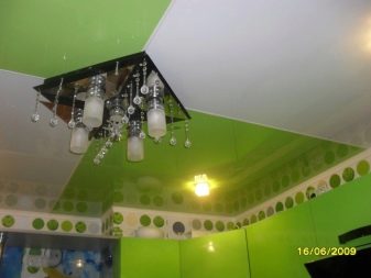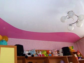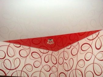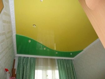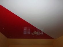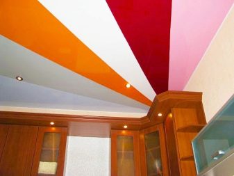 Цветовете на комбинираното таванско покритие трябва да контрастират помежду си, поради което трябва да се избере богат нюанс в съответствие с цветовата палитра на мебелния комплект. Тези цветове са червено, лилаво, зелено. И те могат да бъдат допълнени с бяло, бежово, жълто.