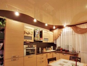 - В кухнята двуцветен таван ще помогне да се раздели пространството на трапезария и зона за готвене. Тази опция за довършване на жилища е особено актуална, чиито размери не позволяват приемането на други методи за зониране – допълнителни стени и прегради, платформи. В централната част на тавана можете да закачите малък полилей.