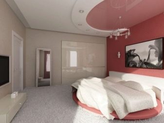 - Преди да инсталирате тавана в спалнята, трябва внимателно да обмислите как ще бъдат подредени мебелите, така че дизайнът да бъде цялостен. Ако стената, върху която лежи главата на леглото, е залепена с ярки тапети, същите нюанси трябва да се използват върху фолиото за таван..