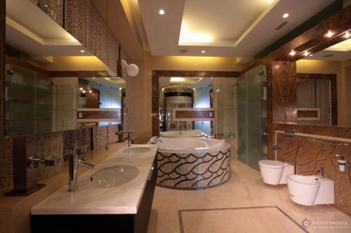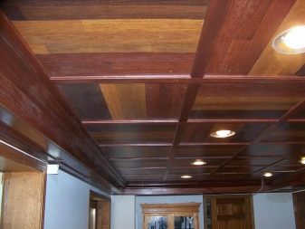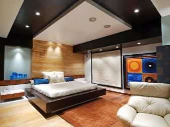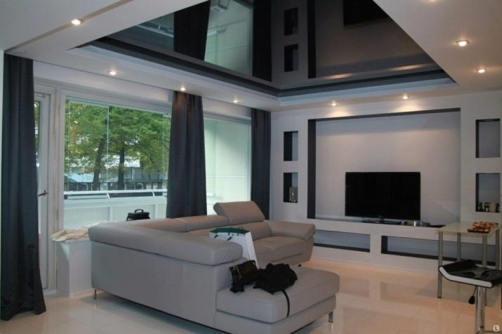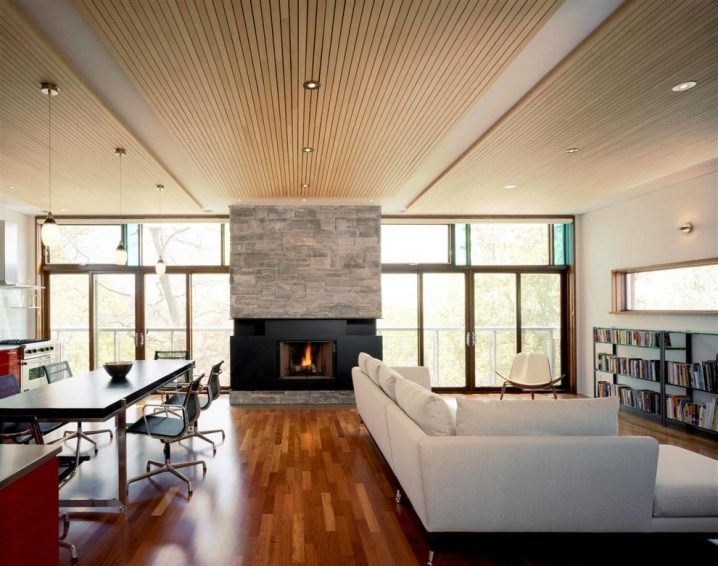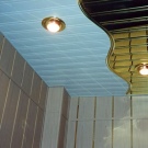 Комбинацията от гипсокартон с таванни панели или ламели изглежда добре. Структурите на едно ниво не са подходящи тук: за предпочитане са релефните тавани с големи прозорци на лампите или панели, осветяващи различни ъгли на стаята.