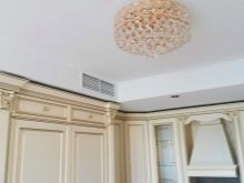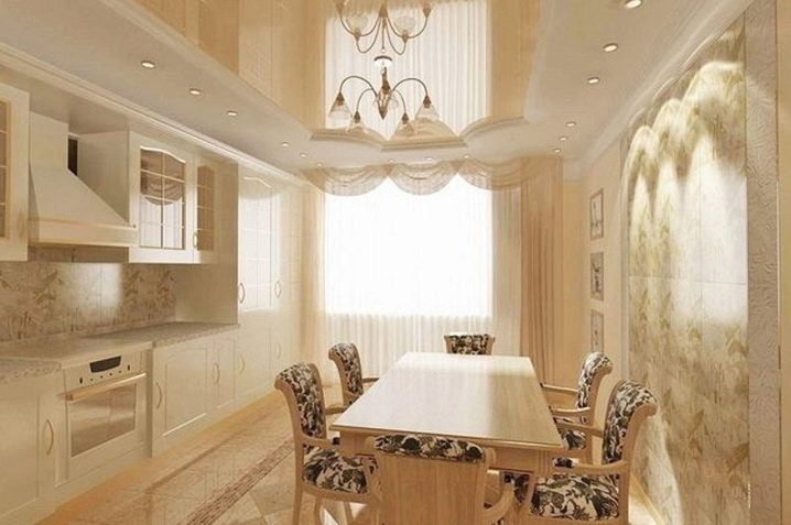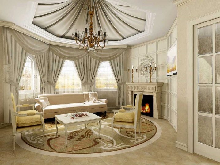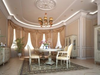 Светлите цветове са за предпочитане, белите и светло бежовите нюанси са особено хармонични. Тяхната комбинация е разрешена, докато свързващият компонент може да бъде тавански цокъл или формоване. Таван от гипсокартон със сатенено опънато платно също ще изглежда красиво. Дизайнът се подчинява на геометрията: основният акцент може да бъде кръгла, квадратна, правоъгълна вложка.