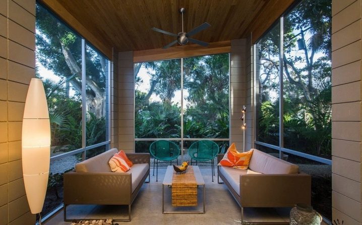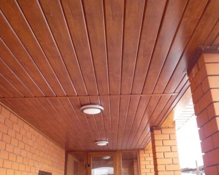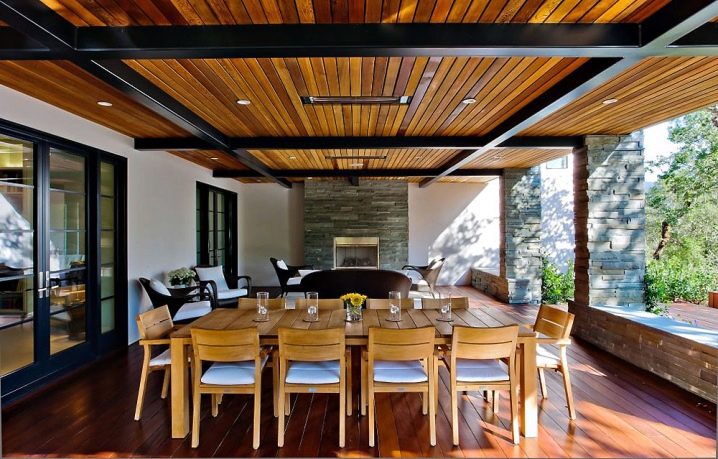 Когато инсталирате окачена конструкция на верандата на частна къща, материалът и цветът се избират, като се вземе предвид специфичен стил. Можете да изберете дървени касети, ламели за масива с желания нюанс (до боядисани на светлина). Ако верандата е затворена, можете да я украсите с гипсокартон.. Струва си да заложите на дървесна текстура.