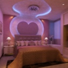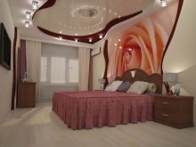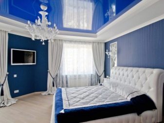 Тук се нуждаете от меки тонове и матова или сатенена текстура. Блясъкът е нежелан: създава емоционален стрес. Не си струва да изграждате повече от две или три нива за спалнята: визуално това ще направи интериора тежък. За да смекчите тоновете, можете да добавите бяло към дизайна. Хармонично добавяне на подсветка с позлатен или сребърен декор.
