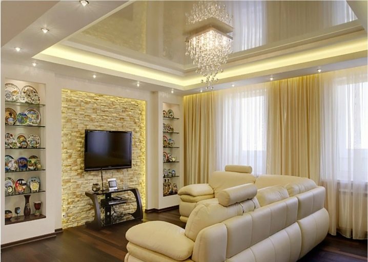 Тази стая е основната в къщата, така че дизайнът й трябва да бъде специален и запомнящ се. Приоритет се дава на топла светлина и богати цветове, комбинацията им с бяло. Дизайнът може да е различен, но дизайнът на братя и сестри ще изглежда прост. Важно е да добавите сатенена и лъскава текстура и стилни тела. Подходящи са опънати тавани с вътрешно осветление.