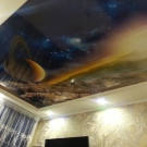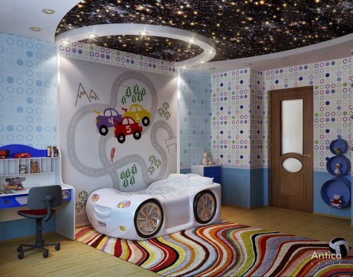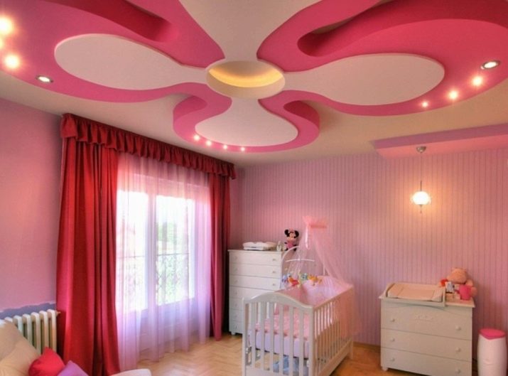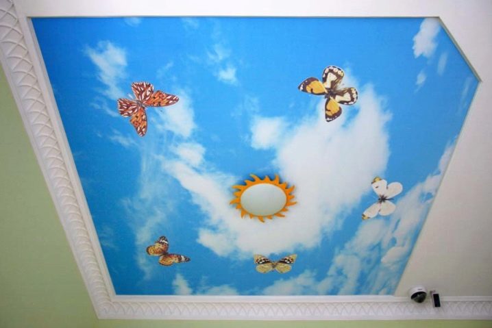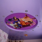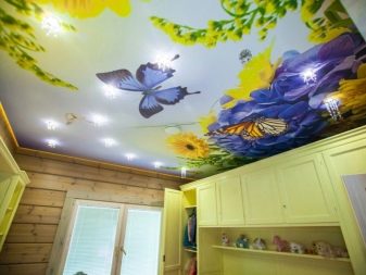 Интериорът на детската стая зависи от възрастта и пола на детето. По -често таванът е украсен с стреч фолио под формата на плътно покритие или отделна вложка. Сенките са избрани меки: те не трябва да дразнят очите.