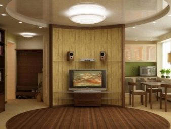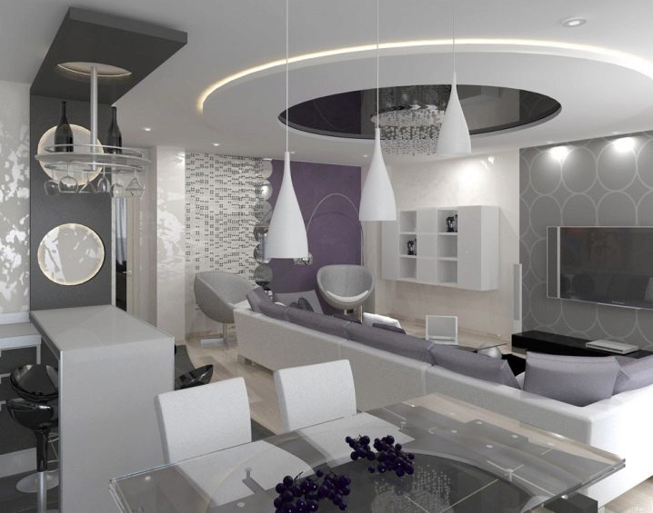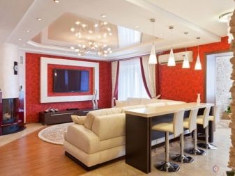 Системите за окачени тавани могат да се използват за получаване на зониране, което дизайнерите използват. Те ви позволяват ненатрапчиво да подчертаете една или две секции от стаята, които са различни по функционалност. По този начин можете да създадете ясна организация на пространството, без да претоварвате интериора с различни прегради или екрани. В същото време хармонията на интериорната композиция не се нарушава..