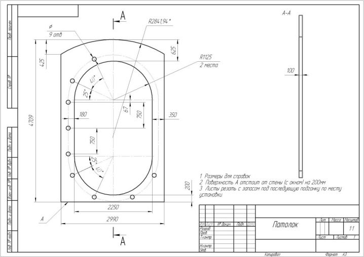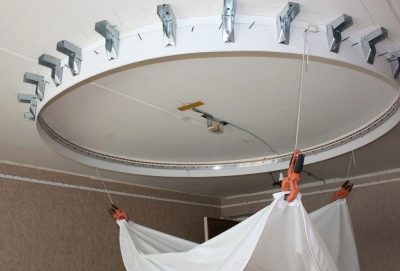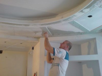 Сложните структури изискват точни изчисления. Груба скица тук не е достатъчна. Ще трябва точно да прехвърлим схемата към тавана, като спазваме всяко огъване и точка на фиксиране на елементите на рамката. Като се има предвид, че те често са с големи размери, ще бъде трудно да се справите сами с инсталацията..