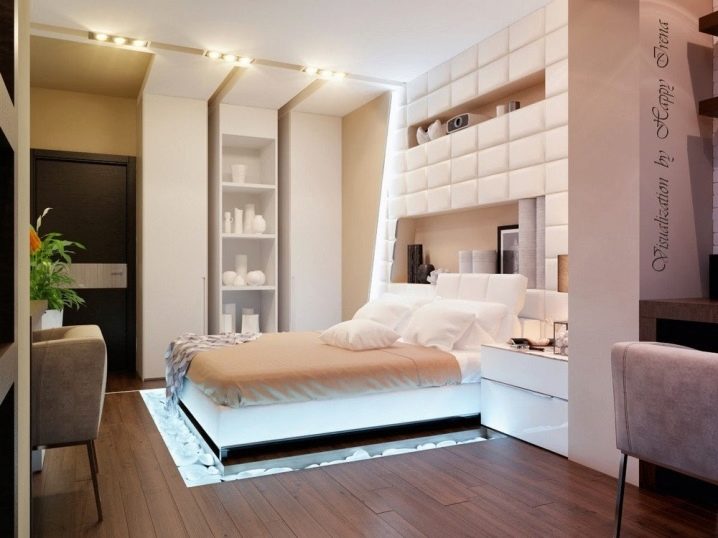 Петната могат да бъдат инсталирани не само върху основната конструкция. За по -голяма хармония на осветяване, те могат да бъдат използвани за украса на една от стените или предната част на шкафа..