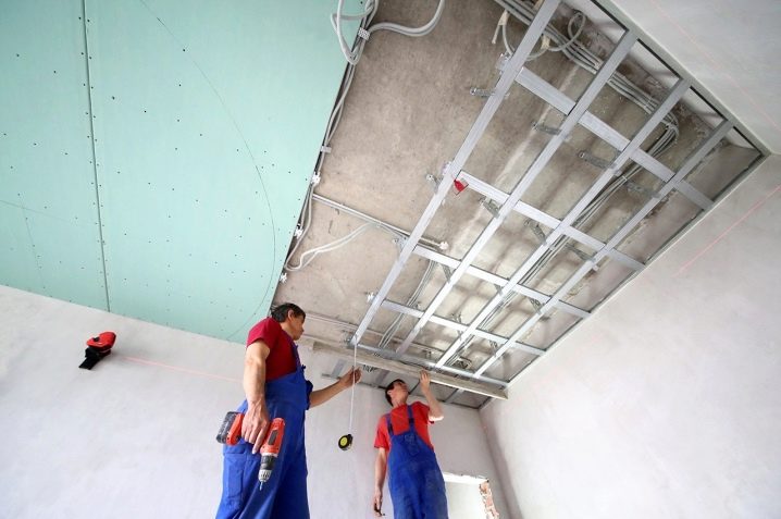 След това върху него се монтира покривният материал. Обикновено за тези цели се използва гипсокартон. Той се отличава с високи експлоатационни и практически свойства и позволява да се реализират всякакви дизайнерски идеи. Окачванията различават окачените тавани от подгънатите колеги, които са прикрепени директно към основата..