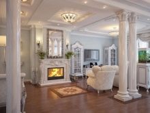 Основната светлина е красив полилей с много ярки малки лампи. Необходими са имитация на гипсова мазилка и наличие на позлата в декора. Когато съставяте композиция, можете да надградите върху декора на мебелите, като изберете подобни резбовани или усукани елементи.