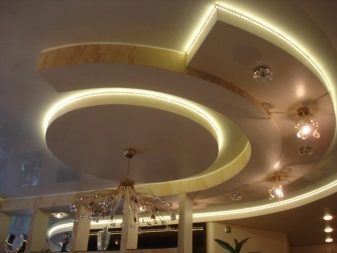 Такива дизайни ви позволяват визуално да победите недостатъците на тавана.. С помощта на тях можете да обозначите издатини, да подредите отвори за колони, абсорбатори, комини, комуникационни системи. В повечето случаи за такива системи се използват леки видове материали. Поради тази причина няма голямо натоварване на основата, а самите системи са здраво закрепени към основата. Те няма да паднат с течение на времето, практически не се нуждаят от настройка по време на работа.