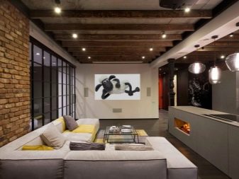 За стилове на таванско помещение и гръндж, умишлено грубите дизайни са за предпочитане. В този случай тонът на покритието трябва да бъде предимно монохромен. Таваните са украсени с греди и комуникационни системи. Като подсветка се използват необичайни осветителни устройства в количество от няколко броя. В допълнение към петна с регулиране. това могат да бъдат полилеи с груба форма.