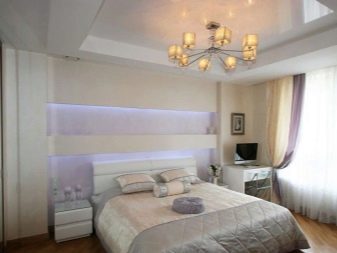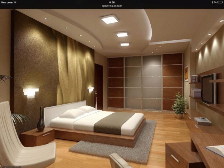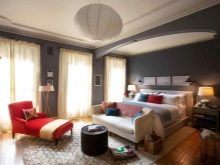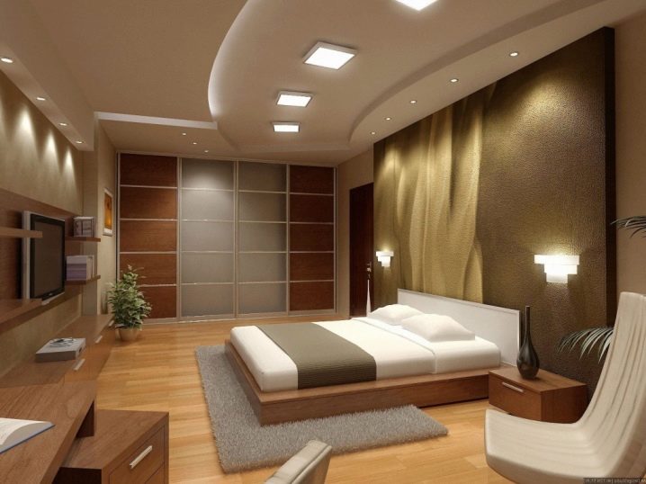 Както бе споменато по -горе, понякога таванът изпълнява не само декоративни функции, но и зонира пространството.. Експертите не препоръчват разделянето на стаята на повече от три зони., дори ако размерът на спалнята е много голям. При изграждането на окачен таван формите му трябва да се припокриват с формите на мебелите, които подчертават..