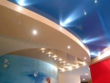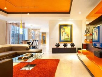 Приятна атмосфера в интериора се получава само с хармонична комбинация от топли и студени нюанси. Ето защо многостепенните тавани често са боядисани в различни цветове, комбинирайки например червено със синьо, оранжево с кафяво.