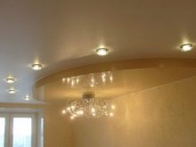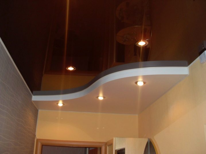 Многостепенните тавани изглеждат не по -малко оригинални, единият “под” на който е направен от лъскаво платно, а другият – от матово. Така че можете да ограничите пространството, като го разделите на тъмни и по -светли зони..