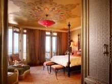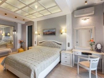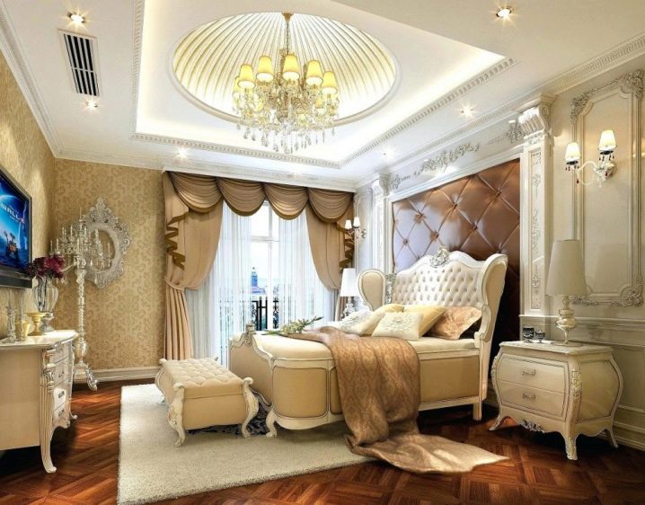 Класически стил предполага спокойни тонове, традиционен мазилка-фриз, позлата. В луксозен интериор таванът може да бъде украсен със стенописи или кесони. Но в същото време цялата останала декорация на спалнята трябва да съответства на нивото на такъв таван..