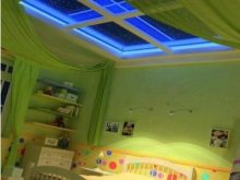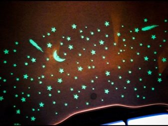 Алтернатива на полилеите могат да бъдат флуоресцентните бои или стикерите за таван, които съхраняват енергия през деня и светят през нощта. Някои производители дори произвеждат опънати тавани с фосфоресциращи орнаменти, сребърни нишки, скрито осветление. Кой вариант да изберете за спалнята, зависи от вас.