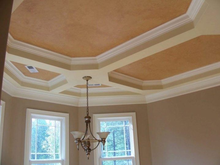 Боядисването отдавна се е превърнало в класика в дизайна на таванското пространство. Обикновено повърхността е боядисана в деликатен цвят с боя на водна основа. Днес подобно покритие не може да се нарече модерно. За да се подобри малко пространството, периметърът на тавана може да бъде покрийте с багети с половин тон по -светъл или по -тъмен от избраната боя.