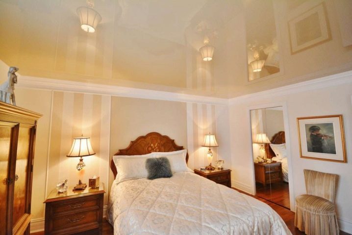 Опънатите тавани ще помогнат не само да опростят ремонтните работи, но и да коригират образа на стаята, да създадат романтична атмосфера или, обратно, да придадат на спалнята аристократична строгост.