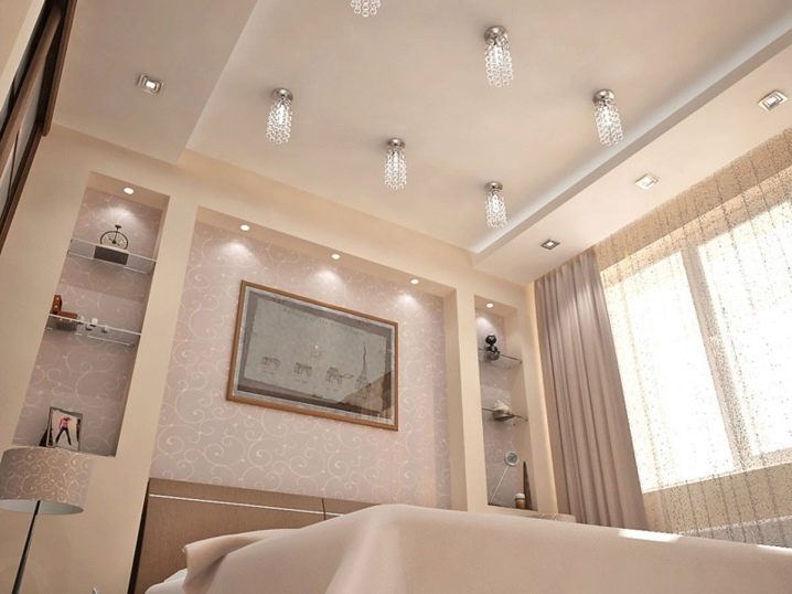 Многостепенните тавани в спалнята могат да бъдат допълнени с декоративни елементи като: