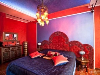 Ако спалнята се намира от източната страна, тогава могат да се използват както топли, така и студени цветове. Но последният трябва да бъде наситен, в противен случай таванът ще изглежда избледнял. Спалните, разположени от западната страна, са лишени от ранното слънце, така че е по -добре да боядисате тавана в топли цветове.