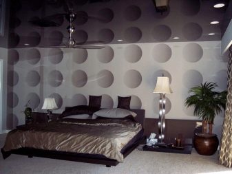 В спални със стил висока технология най -изгодно е да се даде предпочитание на опънати конструкции или да се монтират окачени тавани. Във всеки случай тук ще бъдат подходящи многостепенни структури с различни обеми и форми. Най -добре е да направите таван в такава стая не с прави линии, а с вълнообразни линии, всяка от които може да бъде украсена с оригинални лампи. Огледалата по стените ще допълнят ефекта на простор и визуално ще увеличат спалнята.