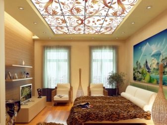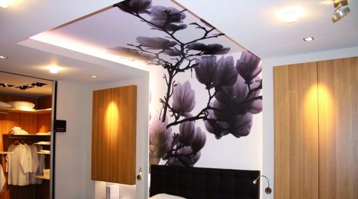 Асиметричните тавани от гипсокартон изглеждат добре на закрито в стил ретро, арт деко, модерен. Но за стаи, декорирани в ориенталски стил, тавани с фотопечат са подходящи. Цъфналите цветни пъпки, орнаменти, ориенталски шарки ще изглеждат страхотно.