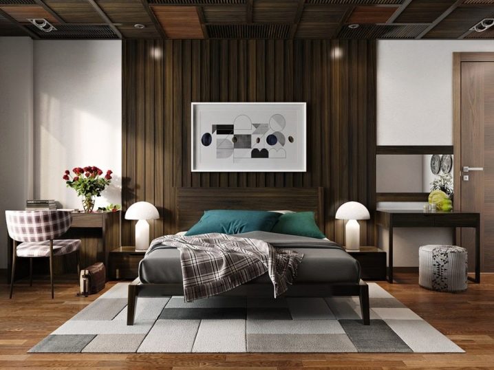 Дървото винаги е било отличителен белег на луксозния интериор. Оригиналната дървена ламперия е чудесен начин да създадете уникална селска или модерна спалня. В допълнение, естественото дърво е отличен елемент за създаване на интериор в еко стил.. Могат да се използват дървени панели – висококачественото изпълнение няма да изглежда по-лошо от оригинала.
