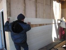 Следващият етап от монтажа трябва да бъде подреждането на топло и хидроизолация. Най -популярните материали, които осигуряват поддържането на комфортен микроклимат в помещението, са Изоспан и Изовер. Изолационните плочи се поставят между водачите на щайгата и се фиксират с дискови дюбели. Материалът се закрепва заедно със строителен телбод и след това се покрива с дифузен хидроизолационен материал, който ще предпази топлоизолатора от въздействието на сняг, дъжд, конденз и вятър. Когато фиксирате филма, не забравяйте, че той трябва да бъде положен с гладката страна нагоре..