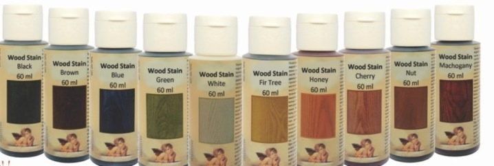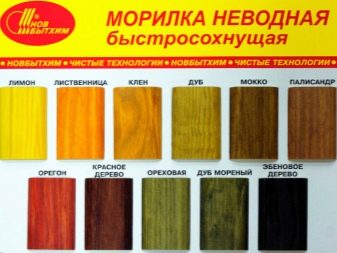 Петната на водна основа имат обширна цветова палитра, която имитира всички дървета: от светло бежово до черно. Ако имате нужда от различен цвят, например зелен, тогава трябва да го потърсите сред неводните петна. За да се създаде богат нюанс, е необходимо да се нанесат няколко слоя или да се добави още сух компонент при приготвяне на разтвор..