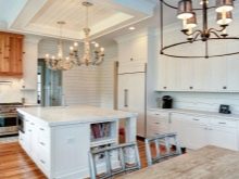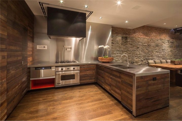 Опцията изглежда страхотно, когато стените са обшити с класическа дървена дъска, а таванът и кухненските шкафове са изработени от материали с лъскава повърхност. Такъв контраст изглежда интересен в интериора на модерна кухня..