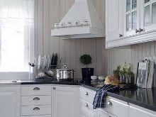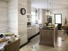 Дървената повърхност от хастара може да бъде боядисана във всеки цвят, например шам фъстък или бледо ванилия. Можете да направите само една стена в този стил, която ще бъде декоративна. На тази стена можете да поставите малки рафтове с подправки и други полезни дреболии за готвене. В същия цвят можете да вземете мебели, кухненски шкафове, които ще бъдат в хармония с дъската и ще допълнят цялостния стил. Същият принцип се използва за направата на проекти в стила на френската кънтри – Прованс..