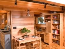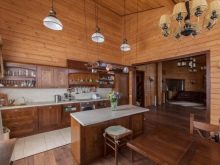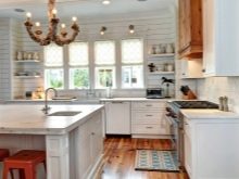 За да бъде кухнята не само практична, но и стилна, препоръчваме да вземете предвид някои от нюансите при декорирането на интериора. Например, в случай, че стаята е изцяло обшита с дъска, тоест стените и тавана, трябва да направите ярък акцент върху мебелите, да изберете ярък бюфет, завеси и т.н..