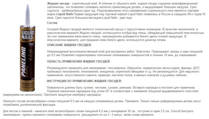 С помощта на този състав материалите са свързани плътно, докато шевовете не се влияят от висока температура, влага и не се появява ръжда. Силата на състава на течните нокти е десет пъти по -висока от тази на PVA лепилото. Бързото изсъхване ви позволява да не държите залепените повърхности дълго време с ръце.