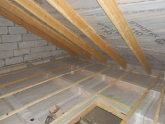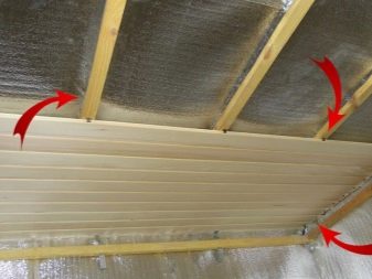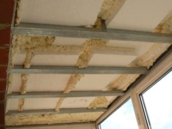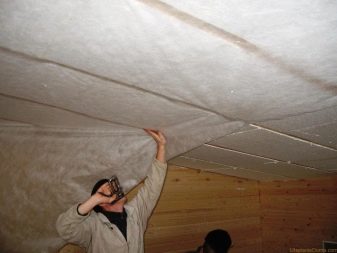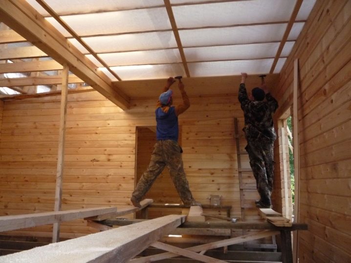 Когато инсталирате системи за окачени тавани, ще бъде препоръчително да поставите изолация. Първо, към дървена основа е прикрепен хидро-бариерен филм, след това се поставя щайга, изработена от пръчка или метален профил. Топлоизолаторът се поставя в пространството между водачите на обшивката. Отгоре всичко е покрито с пароизолационен филм. Можете да използвате валцувана минерална вата или пеноплекс. Покритието е от гипсокартон или ПДЧ.