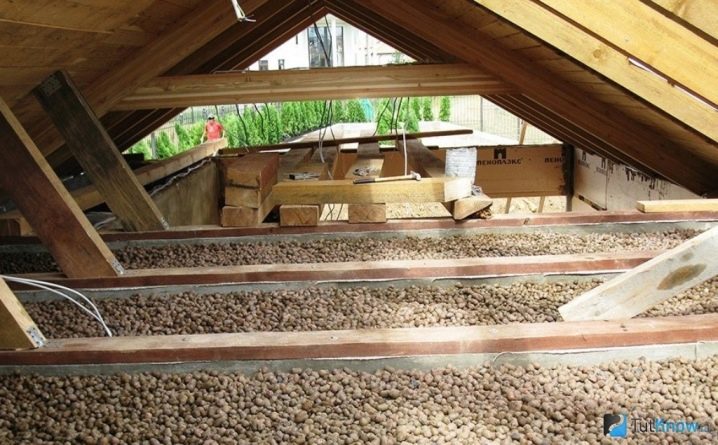 Те могат да се използват за изолация на таванските подове отгоре. Основният материал е експандирана глина. Той идва в няколко фракции. Най -малкият е с диаметър около 5 мм (пясък). По -големият вече има размер до 2 см (чакъл). Най -големият е натрошен камък от експандирана глина, чиято гранула е от 2 до 4 см. Топлоизолационните свойства на всички фракции са еднакви.