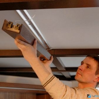За да украсите повърхността на модерен опънат таван с декоративни греди, е необходимо да инсталирате частите, използвани за фиксиране на полилеите.