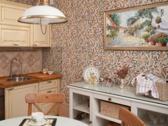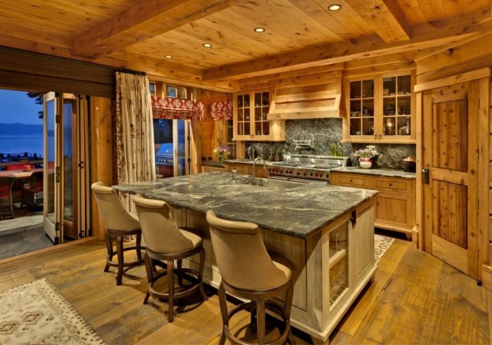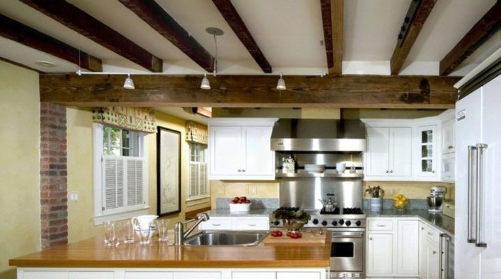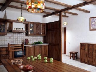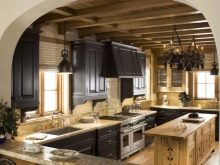 За украса на кухнята в руските традиции за декориране на тавана често се използват широки греди. Тази опция ще му даде оригиналност. Материал като камък често се използва за декориране на кухни. С него могат да бъдат украсени както печки, така и колони. Можете да победите тази техника с помощта на греди от дърво..