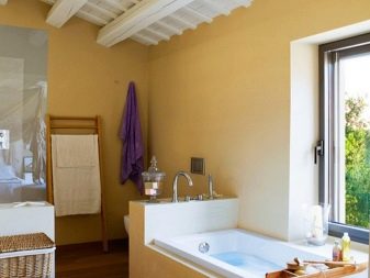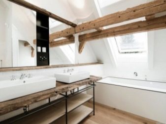 Но в селските къщи, построени сега, където за банята е отделена голяма площ и таваните в тях са високи, можете да използвате греди. Струва си обаче да си припомним за високата влажност на такава стая. Ето защо струва си или да използвате полиуретанови греди, или да обработвате дърво със специални вещества, което ще предпази от влага.